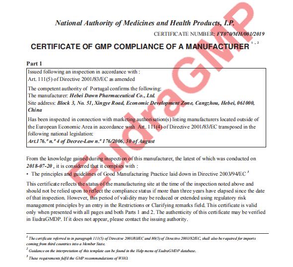 EU GMP Certificate of Dawn Pharma for Injectable Finished Formulation Issued Successfully