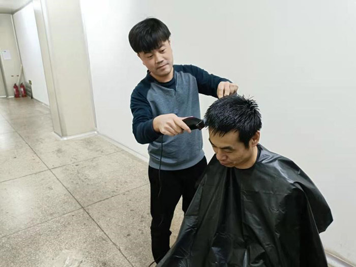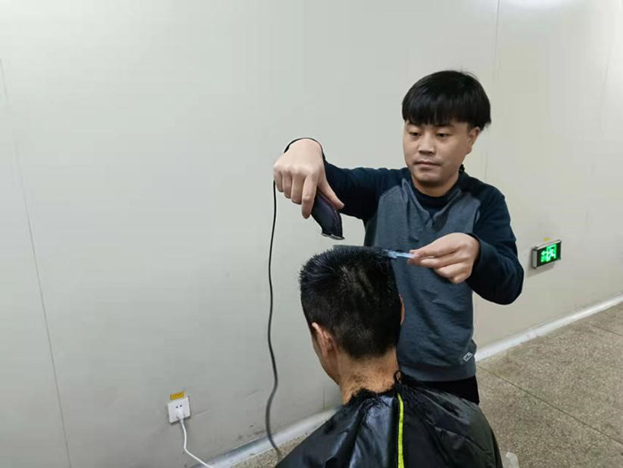 这一幕发生在11月21日公司中提车间。疫情阻击战开始至今已将近一月,为做好抗疫情保生产工作,公司采取了封闭式管理。500多名干部员工驻厂,坚守岗位,加班加点,维护了厂内良好的生产生活秩序。然而,封控近一个月,越来越多的人有了理发需求。尤其是男职工,一个个发压眉、鬓过耳,凌乱而萎靡的样子,让人看在眼里急在心里。