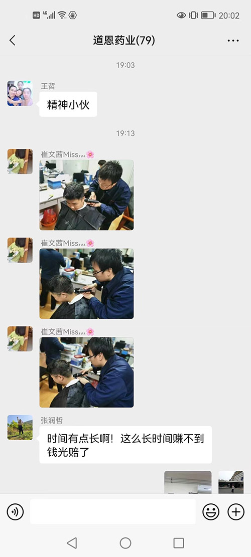 这两天开云体育官方网站药业工作群里被一段段理发的视频和搞笑的评论刷屏了。视频里的“理发师”是开云体育官方网站药业生产总监王学智,他拿着电动推子全神贯注为员工理发,每一下都十分认真,不放过任何一个细节;被理发的“颓废少年”秒变“精神小伙”;围观群众打趣到:“服务这么长时间却赚不到钱,光赔了。”理发现场的气氛十分融洽,隔着屏幕都能让我们感受到那份欢快。