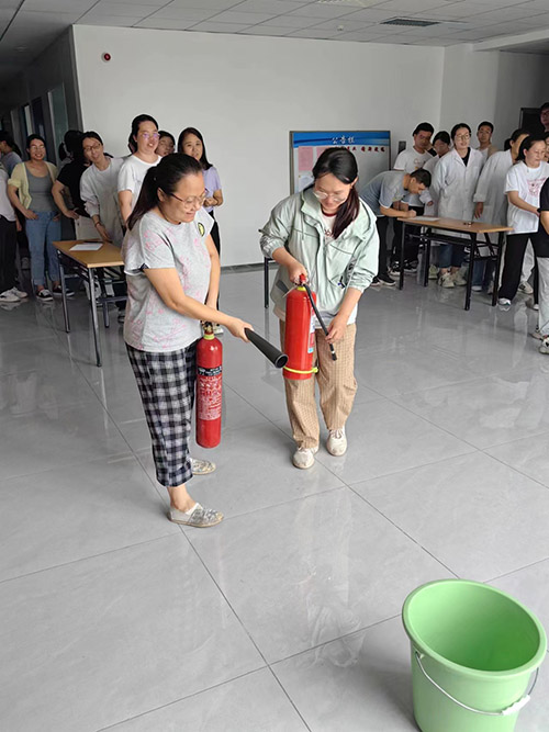 逃生演练结束后组织人员在货梯门前空阔处进行灭火演练及移动式消防器材的灭火演示,全体员工在专业人员的指导下进行现场实地操作;安全员讲解关于新址实验楼建筑消防设施、消防设备的性能特点及作用;使大家学习并了解新实验楼建筑的消防设施、消防设备及灭火器材的使用方法、注意事项。王俊峰院长就本次消防应急逃生演练作总结,并对今后的消防工作进行安排部署。