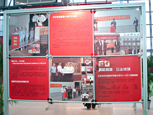 在此次全国药品交易会上,组委会举办了60届专题回顾活动。在“众志成城,抗震救灾——用我们的爱心给你们力量”大型图片展,对全国医药企业,在四川汶川地震时的奉献爱心活动进行了报导,并刊登了我公司王振刚总经理以及我公司员工捐款活动的大幅照片,四川医药工业协会向支持抗震救灾的药界同仁,表示衷心感谢和致敬。全国药品交易会组委会表示,为了支持灾区重建,全国药品交易会将在四川连续举办三次。