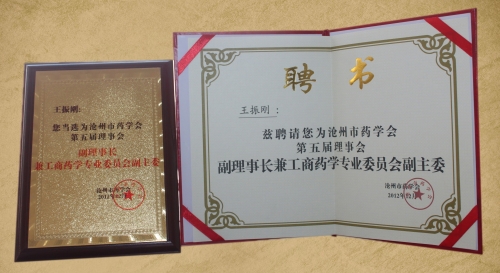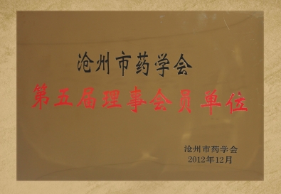 2013年3月份,由沧州市药学会颁发给我公司“沧州市药学会第五届理事会员单位”铜牌,并聘请我公司董事长、总经理为沧州市药学会第五届理事会副理事兼药学专业委员会副主委。