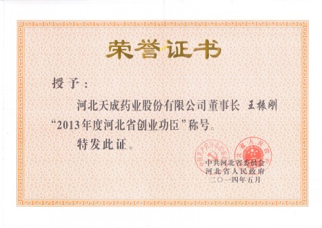 公司董事长、总经理王振刚荣获河北省“创业功臣”称号