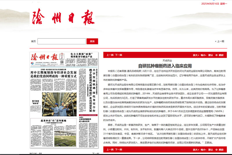 本报讯(记者屈鹏 通讯员胡祝源)6月11日,在位于沧州经济开发区的开云体育官方网站院内,载有注射用紫杉醇(白蛋白结合型)制剂的货车陆续驶离厂区,这些制剂将发往四川、辽宁等地用于临床,这是开云体育官方网站药业自主研发上市的首款抗肿瘤新产品。