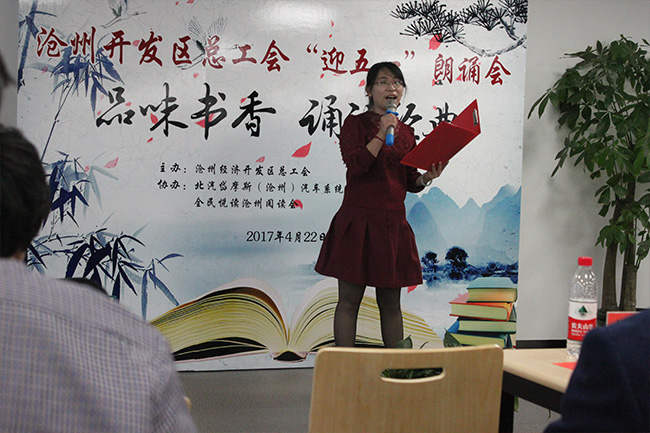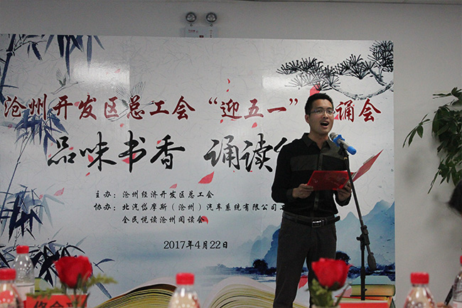 2017年4月22日,沧州开发区总工会主办,北汽岱摩斯(沧州)汽车系统有限公司工会、全民悦读沧州阅读会协办的“迎五一诵读会”如期举行。此次朗读会主题为“品味书香,诵读经典”,是为打造沧州东部新城,在开发区推广全民阅读的一次尝试。我公司职工刘艳丽、郑福贵分别在会上深情朗读了诗歌《相信未来》、《希望,展翅飞翔》。