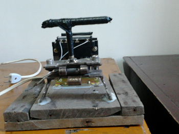 自制热熔压片机初级产品制作完成的那天,我们很激动,像迎接一个新生的婴儿,又像学生答完考卷等待老师的评分。可是,初期的试验结果却给我们泼了一盆冷水。自制热熔压片机初级产品制出的样品薄厚不均,透明度差,根本不符合红外光谱检验的要求,在这种情况下,我们没有灰心,经过进一步的技术讨论,发现热熔压片机的构型是对试验结果影响最大的因素。我们自制的热熔压片机由下列四部分组成:电源连接部分、控制变压器、加热板和成型板。制取薄片样品时,采用绝缘电线与电源连接,为自制热熔压片机供电;通过控制变压器获取合适的电压为加热板供热;将样品置于加热板上;手压成型板,与加热板重合挤压样品成型。其中加热板采用手动压片的方法,这就是造成实验失败的根本原因。