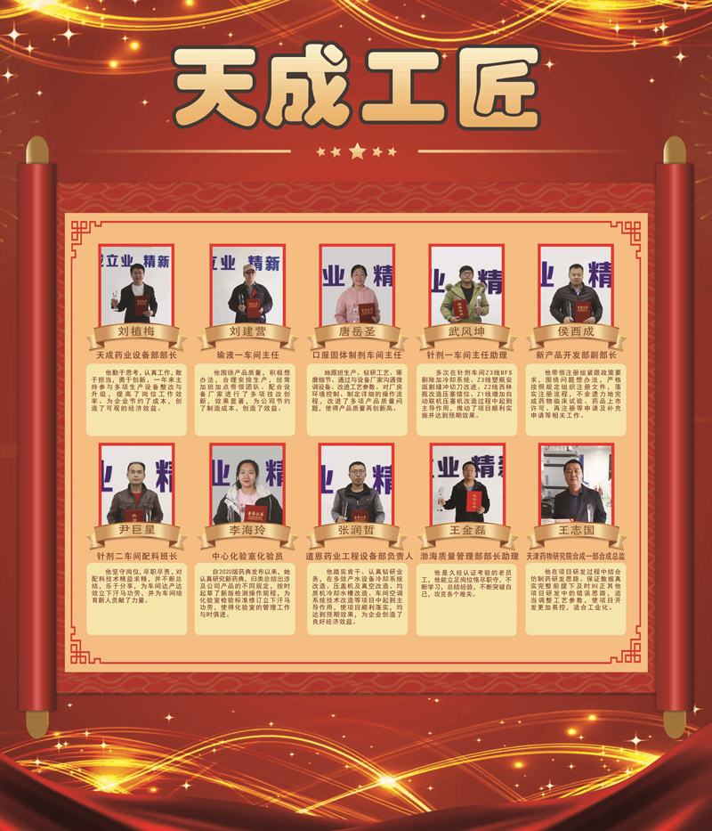 唐岳圣:口服固体制剂车间主任,她跟班生产、钻研工艺、琢磨细节、通过与设备厂家沟通微调设备、改进工艺参数、对厂房环境控制、制定详细的操作流程,改进了多项产品质量问题,使得产品质量再创新高。