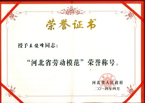 2014年4月荣获“河北省劳动模范”荣誉称号